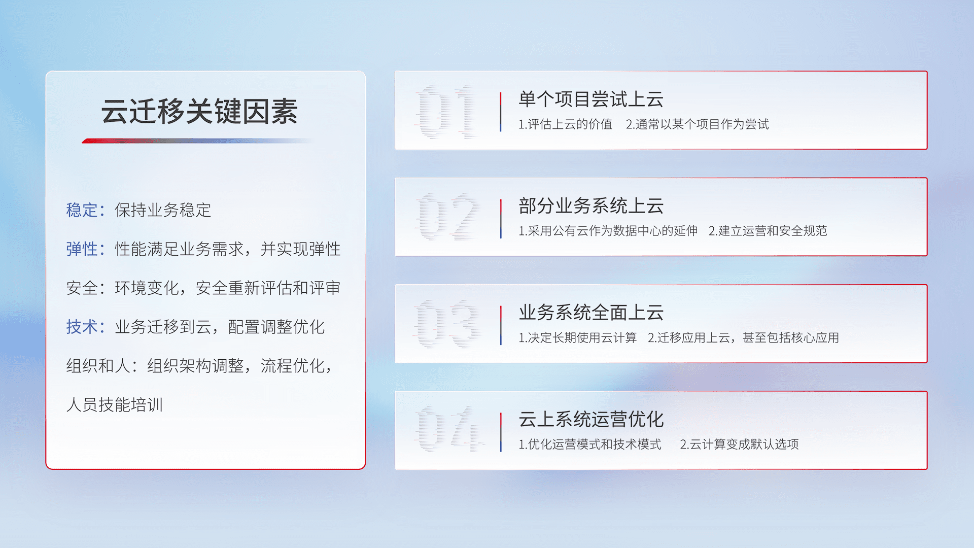 结合实际业务,,,,从规划设计、、、、云平台选型、、云原生改造、、数据迁移、、、集成交付,,,迁移全过程为客户识别最佳上云路径,,做好风险识别管理,,,,设计网络架构、、身份权限、、、、安全审计合规、、、、操作审计、、、日志审计、、、、监控告警策略、、、多站点容灾设计等,,,,对云上基础设施进行整体规划,,,提升IT治理水平,,,以满足弹性、、高可用、、、、高性能的需求。。。
