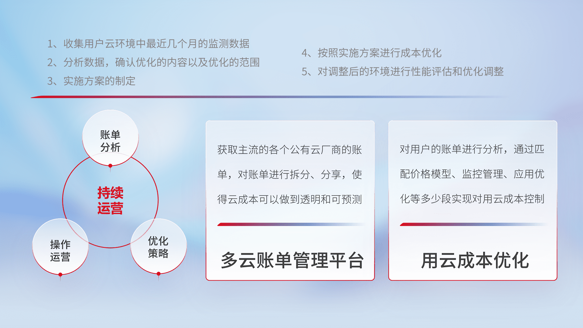 通过多云纳管,,,以统一的资源数据模型把客户的云资源进行抽象和封装,,,,进而实现对多云资源的统一操作,,,保障云资源管理的可靠性、、稳定性与可用性。。。量身定制化运维内容,,,,配置、、、开发运维、、、补丁管理、、、备份、、、、监控、、认证和访问管理、、审计和日常巡检等,,,,保障在用云过程中的可靠度,,稳定度以及高可用率。。。